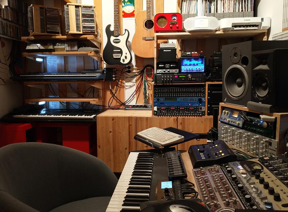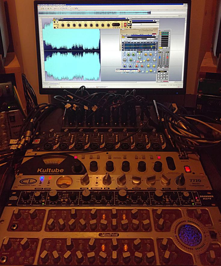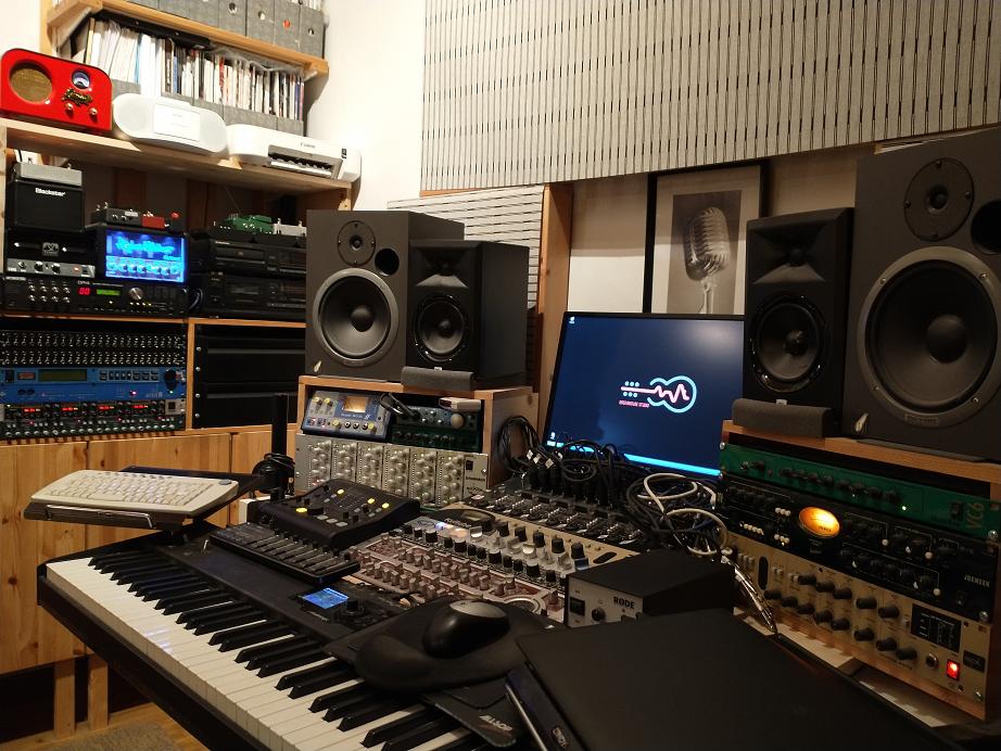 Kalustoa - Etuasteet/prosessorit/efektit mm. Midas, Mindprint, Drawmer, Focusrite, SPL, Audient, Joemeek, Chameleon Labs, LA Audio, Digitech, Ensoniq, ART, SM Pro Audio...Mikrofonit mm. AKG, Audio-Technica, Rode, Blue, MXL, Shure, Audix, Placid Audio, M-Audio, Superlux...Monitorointi ja AD/DA muuntimet - Event, Kali Audio, JBL, Paradigm, Midas, Audient, Palmer. Kuulokkeet - Sennheiser, AKG, Sony, Superlux. - Software mm. Steinberg Nuendo, Wavelab...plugareita mm. Waves, Sonnox, Focusrite, Antares, IK, Lexicon, PSP, Izotope, Elysia, Softube, Nomad Factory, SPL, Native Instruments, Toontrack, Modartt, AAS, Novation, Prosonus...kitaralle/bassolle mm. Bias Amp, Bias FX, Guitar Rig, Amplitube, Softube, Line 6, Overloud...Soittimia ym.: PDP X7 rumpusetti + Pearl free floating 14x3,5" vaahteravirveli, Ludwig acrolite 14x5" alumiinivirveli, Ludwig supralite 14x6,5" teräsvirveli... Marshall DSL putkinuppi, Palmer Eins putkinuppi, Hughes & Kettner Tubemeister 5 putkinuppi, Fender Greta putkinuppi, Peavey 212-C kitarakaappi (Celestion Vintage 30 ja Celestion G12-T 75 kaiuttimilla), MXR M80 Bass DI Plus etuaste/DI/eq/särö bassolle...Studiologic SL73 Studio keyboard + syntikoita, kitaroita, pedaaleita, muuta...
